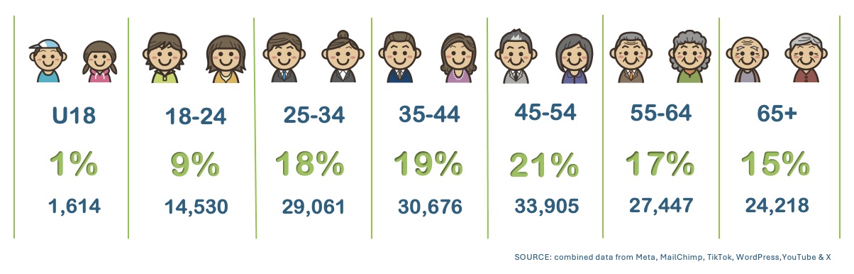 The graphic below reflects our audiences across the channels we manage – gathered from the analytics, insights and extrapolated information available. These are your customers – our audiences – the majority of whom live within an hour’s drive of our area … across Fife, Dundee and Angus, Perthshire and into Edinburgh.